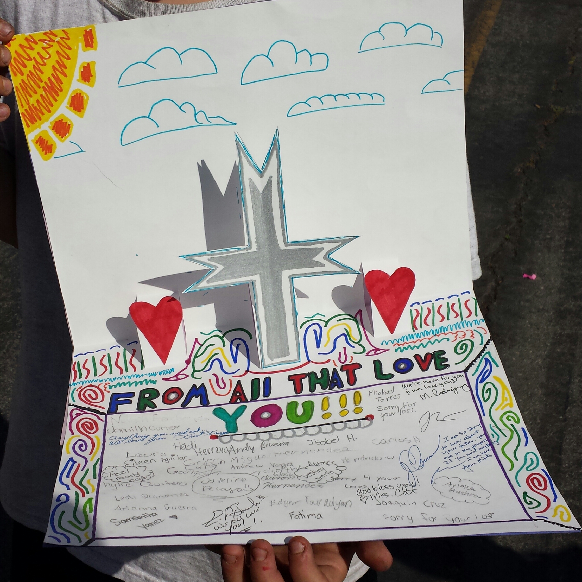 Recently, one of the Physical Education teachers who has taught at the middle school for 30+ years revealed that her father was in the hospital suffering from congestive heart failure. Many of her co-workers prayed for God to comfort the entire family. Her dad passed away a few days later peacefully with his family around him. The following morning she shared this news with me and a student, Freddy when she saw us in the hallway. We both hugged her and expressed our condolences. I asked Freddy if he’d like to make a beautiful card for her to show our support and love.